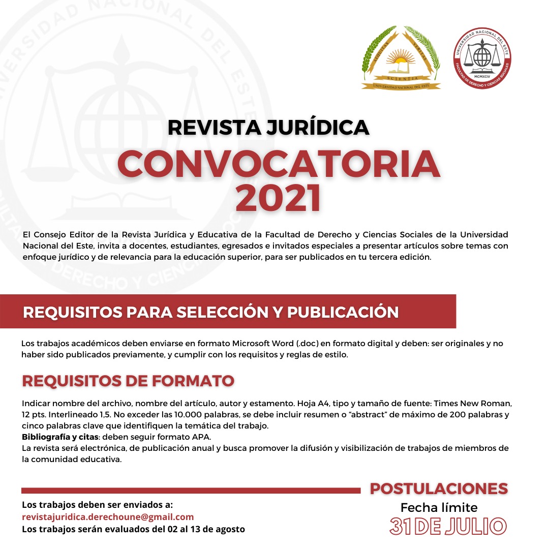 El Consejo Editor de la Revista Jurídica y Educativa de la FDCS UNE invita a presentar artículos sobre temas con enfoque jurídico y de relevancia para la educación superior para ser publicados en su tercera edición.