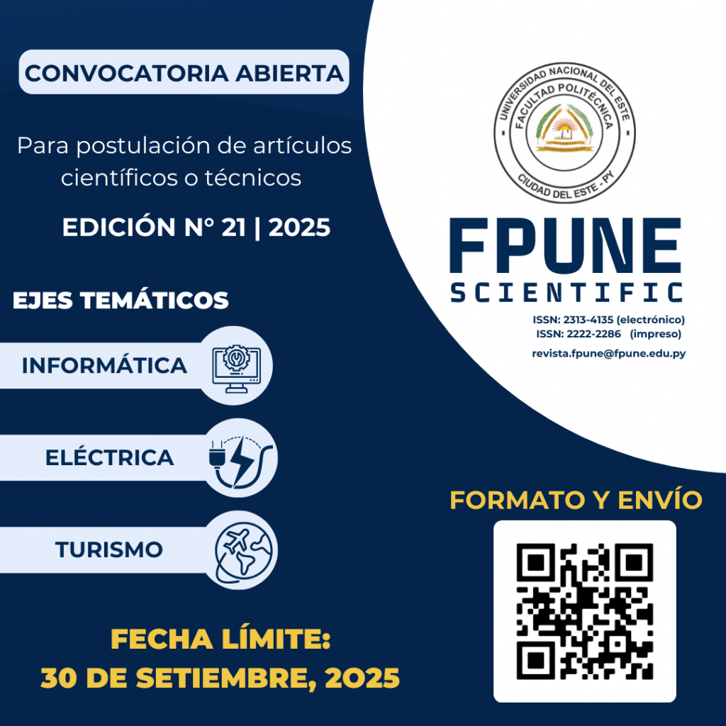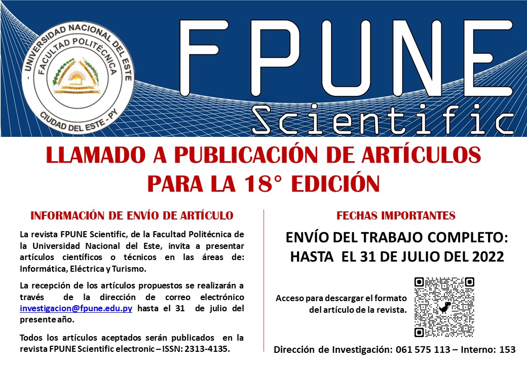 La Revista FPUNE Scientific de la Facultad Politécnica de la Universidad Nacional del Este, invita a presentar artículos científicos o técnicos en la área de informática, eléctrica y turismo.